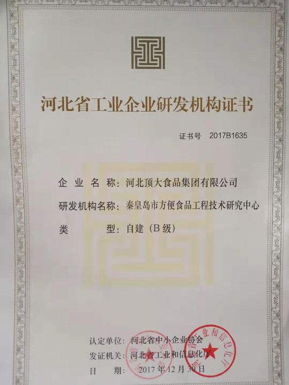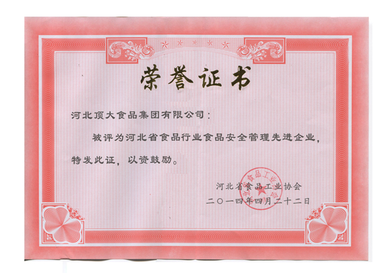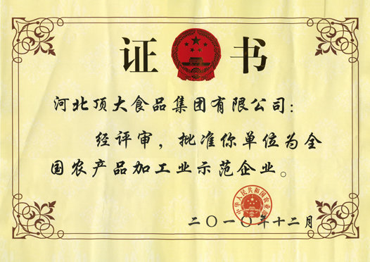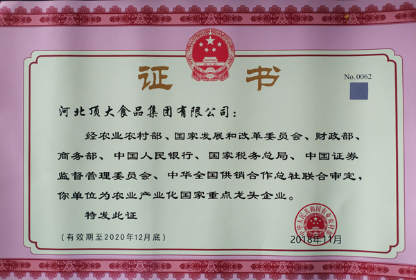 頂大集團(tuán)連續(xù)多年被國(guó)家農(nóng)業(yè)部、發(fā)改委、財(cái)政部、商務(wù)部、人民銀行、國(guó)家稅務(wù)總局、國(guó)家證券監(jiān)委、供銷(xiāo)合作總社等八部委認(rèn)定為“農(nóng)業(yè)產(chǎn)業(yè)化國(guó)家級(jí)重點(diǎn)龍頭企業(yè)”;近幾年,公司被評(píng)定為“全國(guó)食品工業(yè)科技進(jìn)步優(yōu)秀企業(yè)”、“全省鄉(xiāng)鎮(zhèn)企業(yè)技術(shù)創(chuàng)新示范企業(yè)”、“河北省科技型中小企業(yè)”、“河北省食品安全先進(jìn)企業(yè)”、“河北省科技小巨人企業(yè)”和“河北省工業(yè)企業(yè)研發(fā)機(jī)構(gòu)”等榮譽(yù)稱(chēng)號(hào)。